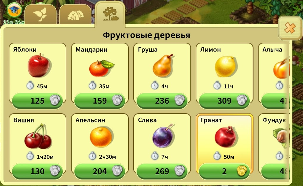 Деревья за золотые монеты плодоносят чаще и большее количество раз.